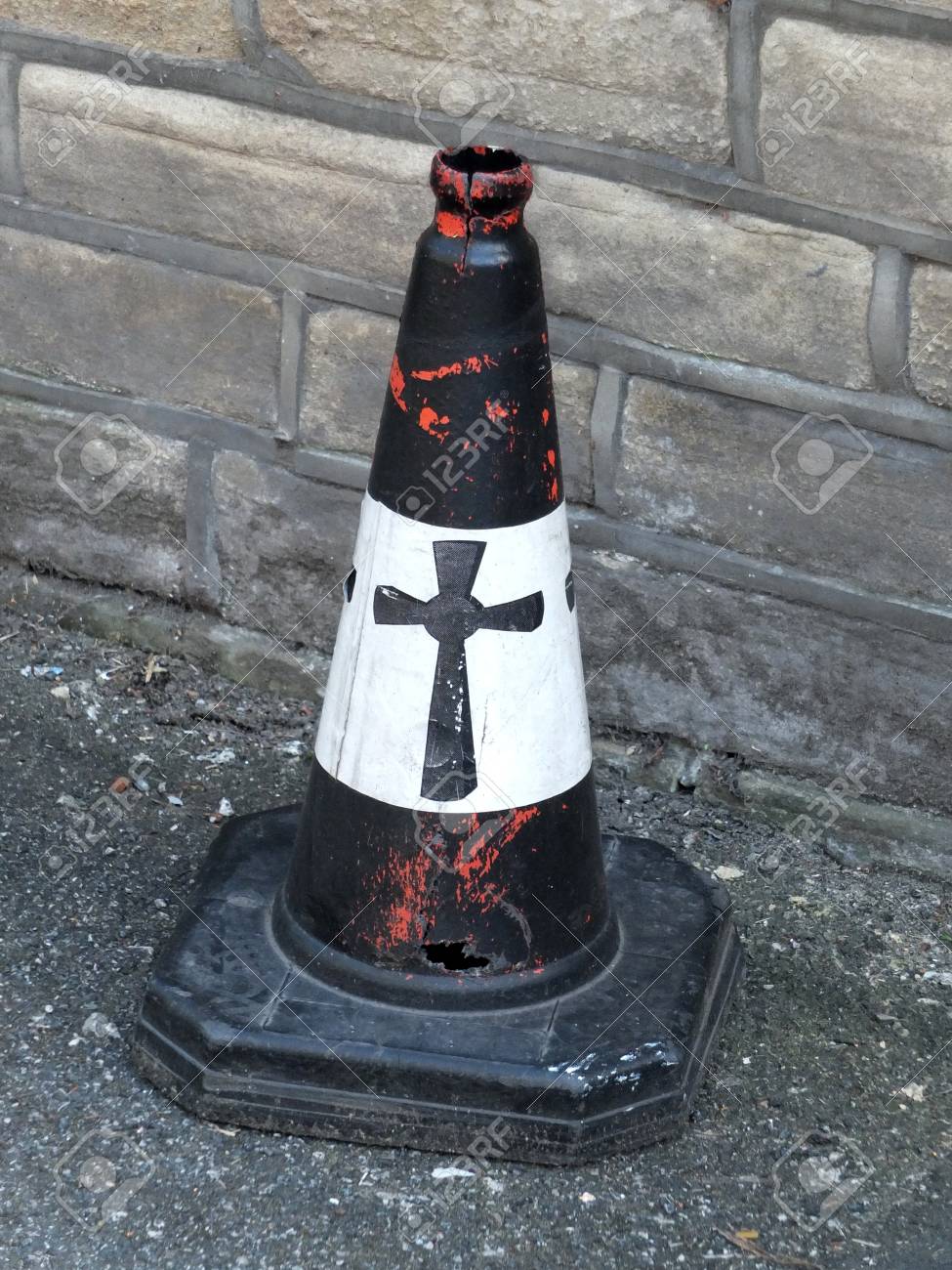 A Black Painted Traffic Cone With A Religious Cross Painted On It Stock Photo Picture And Royalty Free Image Image 110043047